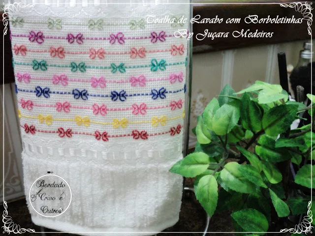 Toalha em Bordado Iugoslavo, fiz cada borboletinha/lacinho de um cor suave para fica delicada usei linhas Perle da Coats Corrente e toalha da Dohler.