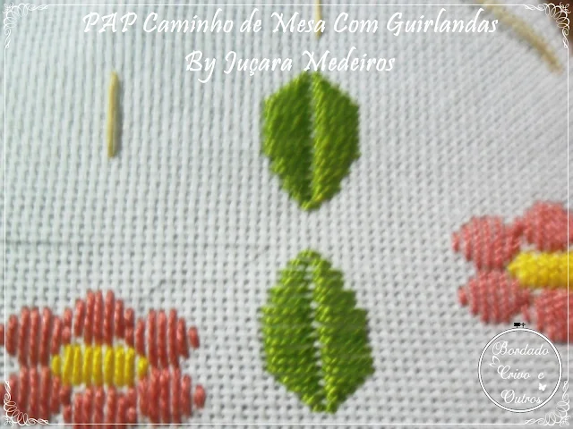Há tempos quero fazer um bordado com guirlandas, mas é complicado criar e desenvolver bordado em circulo, porem tentei e tentei até conseguir então crie este caminho de mesa com guirlandas, tentei fazer uma gráfico pra ajudar não ficou lá estas coisa mas saiu. Espero que goste e tenham paciência são muuuuuuuuitas fotos para ajudar quem ainda nem sabe bordar.